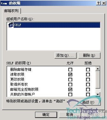 默认情况下只有一个“SELF”组,其它权限的指定方法和我们在Windows里的安全权限指定类似,权限的具体功能可以从字面意思理解,大家还可以点击“添加”按钮来进行用户的添加。