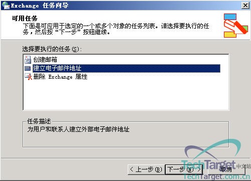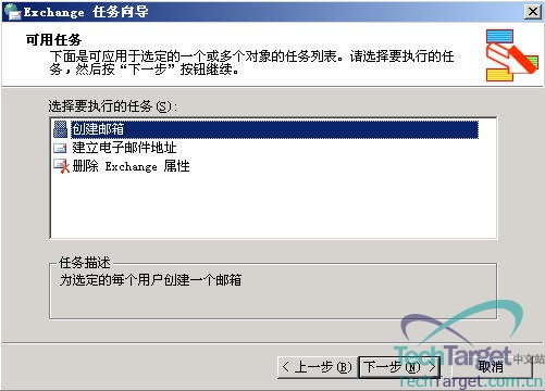上图中会出现三个任务,我们用得最多的是第一个任务“创建邮箱”,第二个任务“建立电子邮件地址”,这个任务用到的几率不是很高,但有些特殊的情况也会用到,至于第三个任务“删除Exchange属性”基本上不会用到,所以这里我只讲前两个任务,现在我们先选中第一个任务“创建邮箱”,然后点“下一步”: