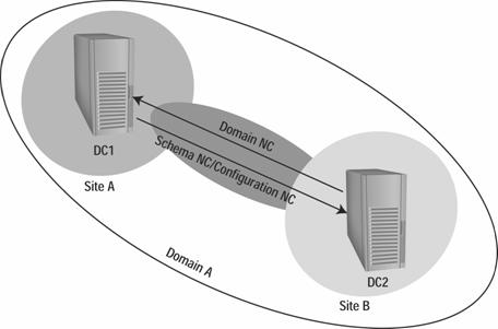 如果有些DC之间没有高速连接,你就需要创建多个站点,分离的站点之间的复制称为站间复制。AD管理员使用Active Directory站点与管理控制台(MMC)管理单元来创建站点链路,它提供了站点之间进行数据复制的通道。在AD管理员建立这些通道之后,KCC在链接的站点之间创建连接对象。典型情况下,并不是所有的DC共享所有的信息(比如,各个域中的DC可能维护不同的数据)。因此,KCC可能需要建立多个连接对象来确保在整个企业中的每个NC被完全复制。在图1中显示了一个站间连接对象的例子,站点A与站点B通过一个手工创建的站点链路连接。在这个例子中,KCC已经创建了两个单向连接对象复制来自同一个域中二台DC之间的三个NC。