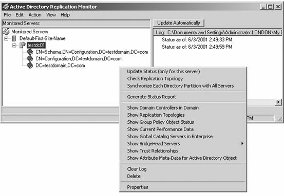 这个程序打开时没有与任何服务器连接,你需要手工添加希望监视的服务器。一个快速添加服务器的方法是创建一个包含服务器列表的.ini文件,每一行一个名称。然后,从Replmon菜单条上单击“File”*“Script”,并找到你创建的.ini文件,单击“open”,Replmon会显示你的DC及DC所拥有的NC。在图2所示的例子中,我添加了testdc01这台服务器,在testdc01项目下面,你能够看到这个DC所拥有的三个NC。为查看你能够使用Replmon所实施的任务,如图2所示那样,右击服务器名称。你应该熟悉这里的各个你需要排除NC复制问题时能够提供在事件中的任务及信息。