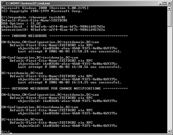 Repadmin。Repadmin.exe是一个你可以在Windows 2000 Server CD-ROM中发现的命令行工具,可能是你复制百宝箱中的一把锤子。这个工具能够揭示出复制的内部工作过程,并帮助你排除和修复问题。查看Repadmin命令行选项,输入下面的命令: