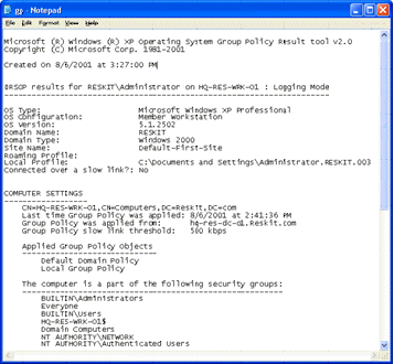 当收集完系统信息后,RSoP 结果将出现在屏幕上。可以打印或保存该报告,也可以将其发送给管理员。在本例中,报告最先显示的几个条目如下方“图 10”所示。