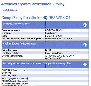 虽然对管理员来说用途有限,但普通用户可以在自己的计算机上,运行帮助和支持中心的 RSoP 报告工具,来验证策略设置。该工具提供了有关计算机上运行的大多数有效策略的直观易懂的报告。