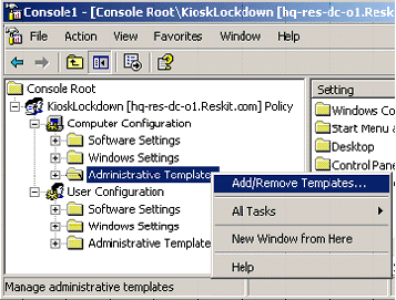 为了管理 Windows XP 客户端,管理员需要一台运行 Windows XP 的计算机,并带有已更新的管理模板文件 (.adm)。这些文件为组策略管理单元控制台树中的管理模板文件夹下的条目,提供策略信息,如下方“图 3”所示。