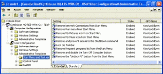 可以在左侧窗格中扩展策略树,并定位任何已对目标用户生效的策略。在本例中,RSoP 显示用户 Cynthia 受通过 GPO Kiosklockdown 启用的各种策略的约束。
