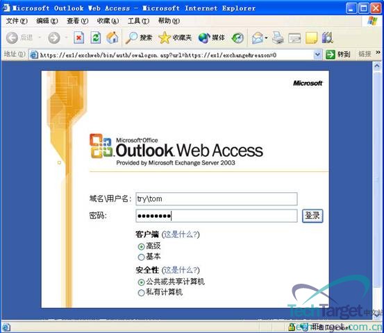 那么到这里呢,服务器上的修改就算是完成了,我们现在到客户端上去验证一下,看看有没有生效。转到客户端上,用“TOM”这个用户登陆,打开IE浏览器,在地址栏里输入:https://ex1/exchange,并回车: