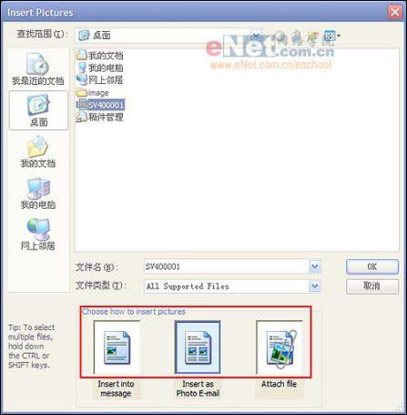 在点击了“Photo e-mail”选项之后,就能看到它的“真容”了,如图12所示。其实这里的主要名堂就在下面的三个按钮中。如果选取照片时保持了默认的中间按钮,那么最终插入到邮件里的照片就可以进行很多的修饰;而如果选取照片时选择的是第一个按钮,那么这张照片只能像普通图片一样被插入到邮件之中,无法进行进一步的编辑了;只有最后一个按钮是最简单的,它就是将照片当作一个普通附件附加于邮件之后,和以前的用法完全一致。如图13所示