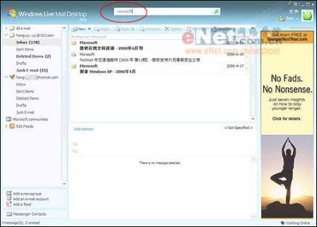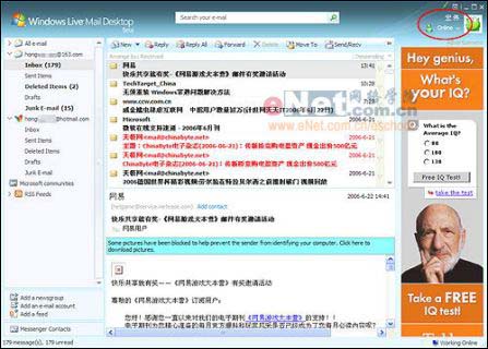 如图2所示便是完成登录后的WLMD主界面,和笔者预想的一样,几乎就是将网页版Windows Live Mail搬了下来。不过,仔细看一下还是有个小小的变化,在界面右上角,看到了一个WLM的状态图标,这样在WLMD中就可以直接设置Windows Live Messenger的工作状态了。
