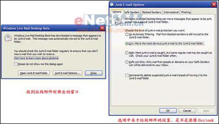 在测试邮件接收时,笔者欣喜地发现,WLMD就像Outlook一样,支持反垃圾邮件功能。而经过后来对菜单的仔细研究,发现这个功能还是相当强大的,几乎就是一个微缩的Outlook。如图4所示。