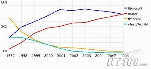 Netcraft报道,Apache已经超越微软成为开发者首选的SSL服务器,有44.0%的加密连接网站使用Apache作为服务器,43.8%使用微软产品。作为SSL协议的最初开发者,Netscape原本拥有最多的市场。但是Netscape的市场份额很快被微软借助IIS超越,IIS在几年内始终拥有40-50%的市场。Apache的第一版不支持SSL,因为美国对加密算法有出口限制,所以开源项目的加密部分必须放到美国境外进行开发,同时必须单独发布。因此许多独立的项目为Apache提供了SSL支持,包括Apache-SSL和mod_ssl。但是当时一些商业版本的SSL模块,比如c2net的Stronghold更为流行。到了Apache第二版,mod_ssl被作为默认模块包含进来,Apache开始成为一个流行的SSL服务器。Netcraft's SSL调查自从1996年开始跟踪互联网上不断增多的SSL Web服务器,所用的服务器软件,操作系统和验证算法。http://news.netcraft.com/archives/2006/04/26/