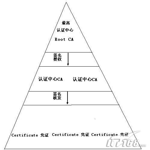 SSL 采用的是 X.509协议,由上而下金字塔式的凭证制度(图2)。在 X.509 中,每一个合格的凭证上,都会有一个签名。最下层的凭证上,会有一个认证中心 (CA)的签名,表示这个认证中心 (CA) 检查过,确认所有者数据无误。中间的认证中心(CA) 上,也会有管辖它的最高层认证中心 (Root CA)的签名,表示最高层认证中心授权给它,可以签发别人的凭证。只有最高层认证中心上,因为它已经是最大,没有再上层可以给它签名了,所以只好自己签自己,凭证上的签名是自己签的。X.509标准用于在大型计算机网络提供目录服务,X.509提供了一种用于认证X.509服务的PKI结构,两者都属于ISO和ITU提出的X系列国际标准,目前,有许多公司发展了基于X.509的产品,例如Visa、MasterCard 、Netscape,而且基于该标准的Internet和Intranet产品越来越多。X.509是目前唯一的已经实施的PKI系统。X.509 V3是目前的最新版本,在原有版本的基础上扩充了许多功能,目前电子商务的安全电子交易(SET)协议也采用基于X.509 V3。