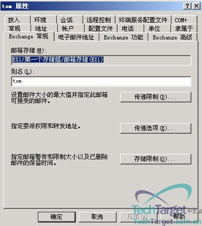 首先,我们来看一下在没有配置Exchange前端服务器前的一种情况,我的实验环境总共有一两台Exchange服务器,分别是EX1和EX2,EX1经过前面的几篇文章已经配置了SSL等,所以在EX2上也进行相同的配置,配置过程全部相同,这里就不再叙述了,现在所有的用户邮箱全部在EX1上面,我们现在就用其中的一个叫TOM的用户,来看一下这个用户的属性: