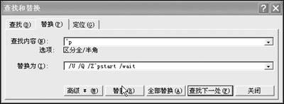 第五步:在打开的“查找和替换”窗口中把“查找的内容”设为“^p”,然后点击“替换”标签,接着在“替换为”输入框中将替换的内容设置为“ /U /Q /Z^pstart /wait ”,注意在wait后要有一个空格(如图1);