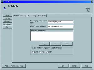 必须按下Account 按纽,并选取Mail Accout,创建了一个新的用户后,Messaging Server不会自动为用户创建一个INBOX, 只有在这个用户进行正常的E-mail收发时,INBOX才会自动被创建。