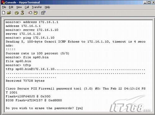 我们也可以直接执行write net 172.16.1.10/pixfirewall/ios命令将IOS数据写到TFTP服务器上。
