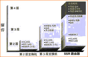 除了支持第二层交换和线速全功能路由外,SSR 还可以支持第四层交换,增加了对应用流的控制,其性能远远超越了传统的路由器。这一先进的功能可为网络流量提供精确的控制能力:拥有较高的安全性、端口级的记帐能力以及复杂的QoS(QualityofService)功能,所有这些都在应用层完成,并且不影响其线速性能。