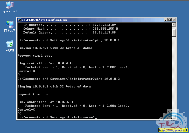 4、下面在远程客户端来测试下在没有拨入VPN服务器前时的网络通讯情况。如下图,显然,此时是PING不通10.0.0.1/10.0.0.2这个IP的。