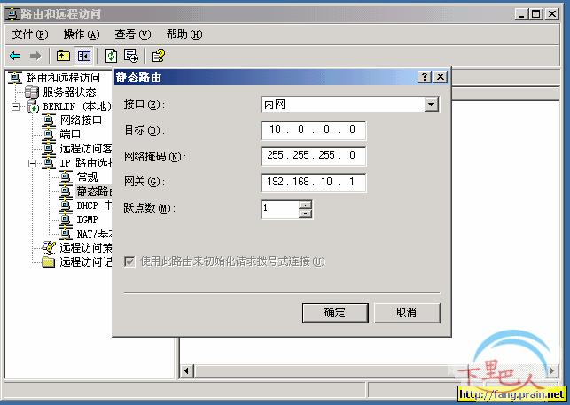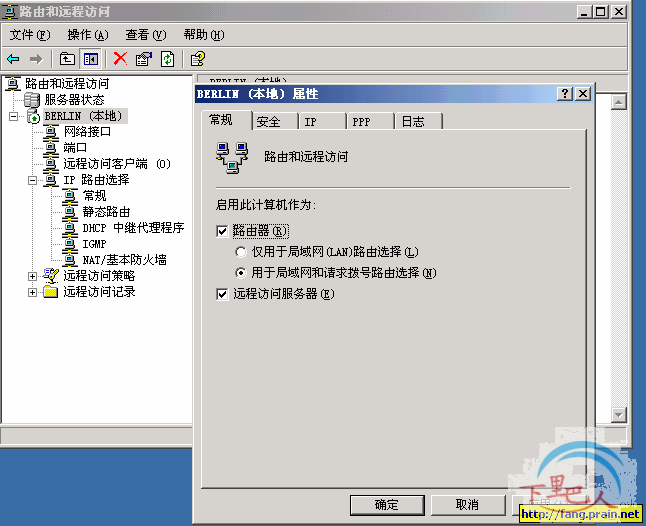 5、接下来的操作就是相当重要的,那就是为了使VPN服务器(也称为远程访问服务器)能正常的转发远程VPN客户端与内部局域网机器之间的通讯的数据包。就要添加一个静态路由以充许它们之间通讯。如下几图,在“路由和远程访问”控制面板中,右键单击BERLIN,选择“属性”,在打开的窗口中,考察“常规”项,使其选择和图中的一样。