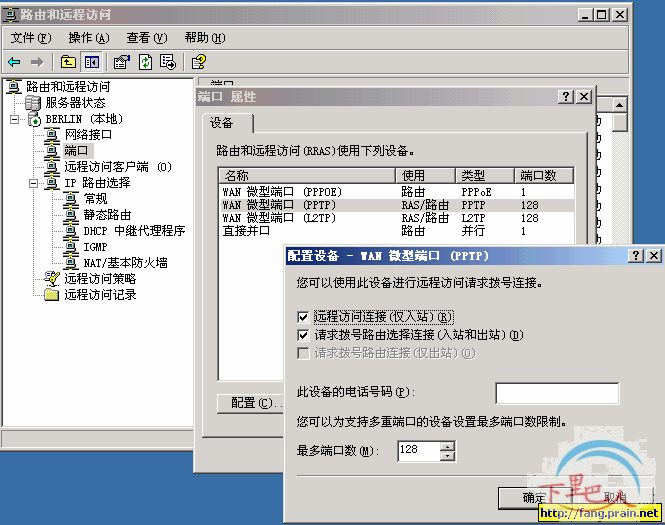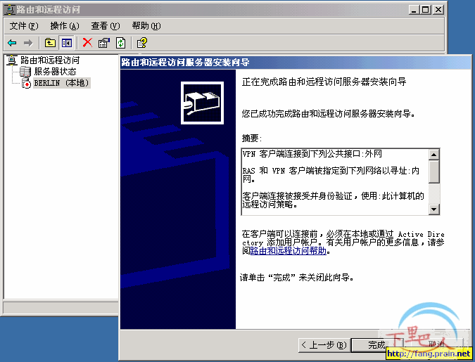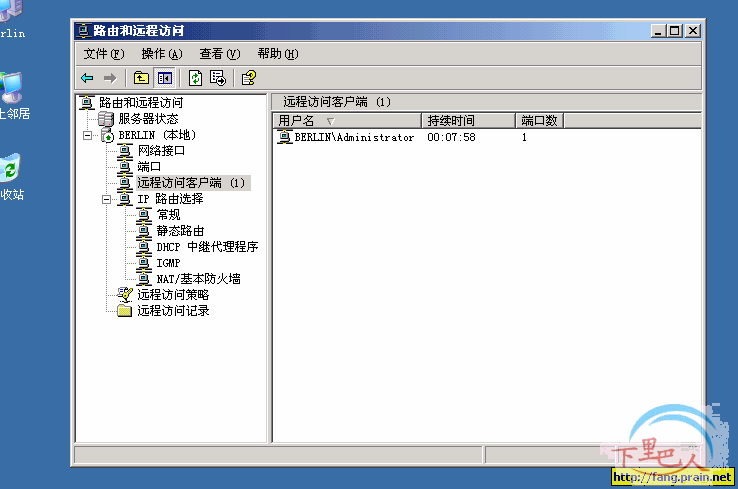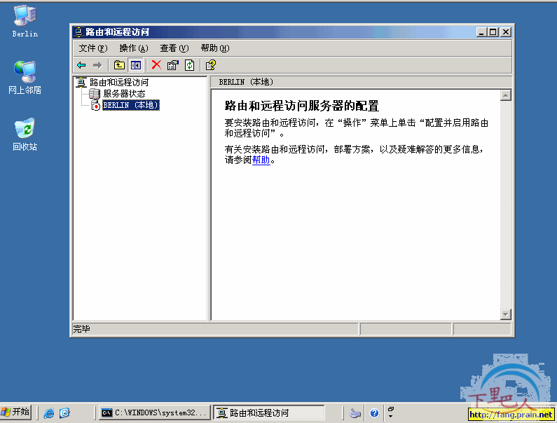 1、在BERLIN这台WINDOWS 2003 SP1服务器上,打开“开始---程序---管理工具---路由和远程访问”,如下图,由于没有启用,现在还是停止标识。