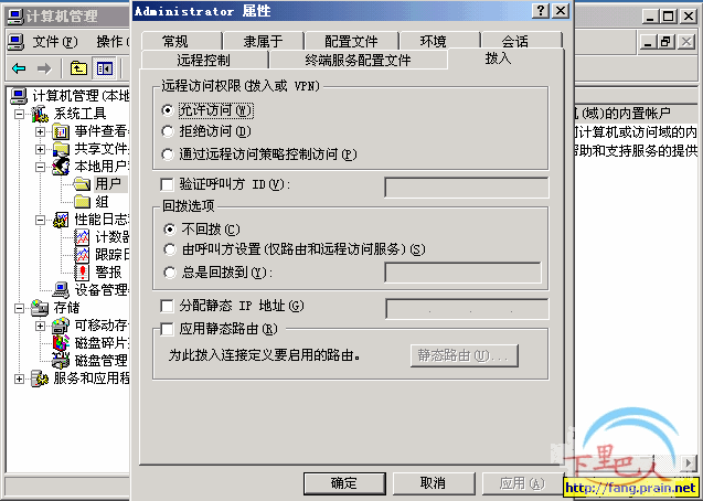 6、启用VPN服务器上的”administrator”远程拨入的权限。