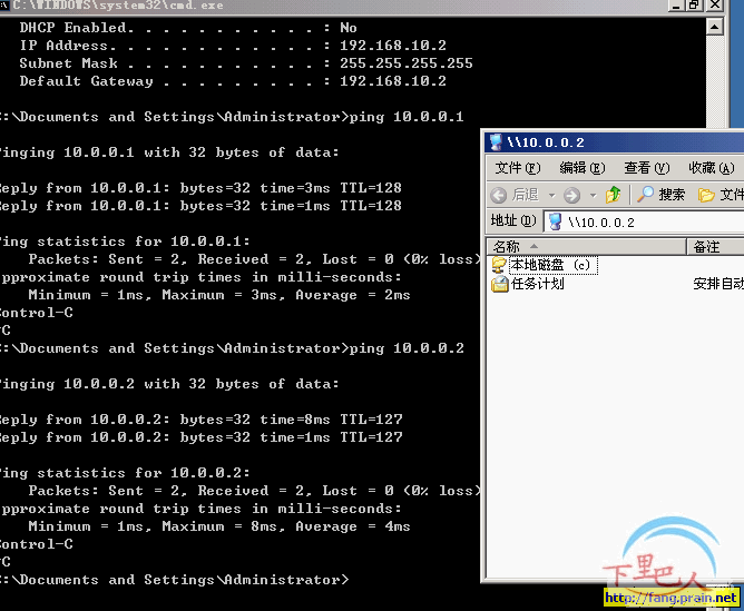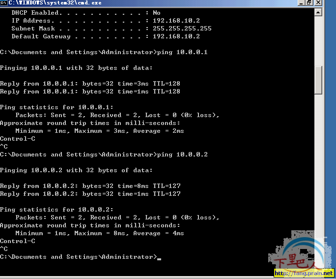 8、下图显示了远程客户端拨入远程服务器(VPN服务器)时所分配的IP情况。并PING下10.0.0.1/10.0.0.2当然是能通的。