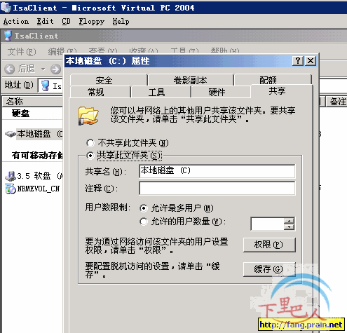 4、为了验证其与内部局域网的通讯,使用了远程VPN客户端vpnrouter1访问内部机器isaclient上共享的文件功能。
