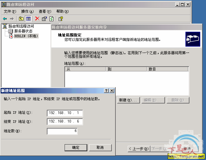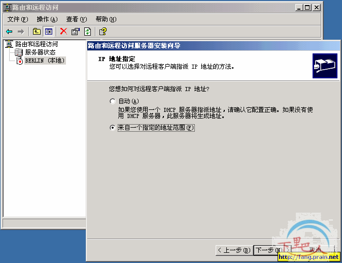 3、在下面的几图中,需要说明下。实际上前面已说过。我在“IP地址指定”这个步骤,选择“来自一个指定的地址范围”将输入一个不同于VPN服务器内部网络的IP地址范围,并创建一个静态路由来达到与内部局域通讯的目的。之后完成VPN服务器端的配置操作。