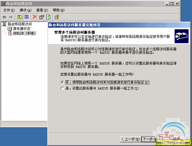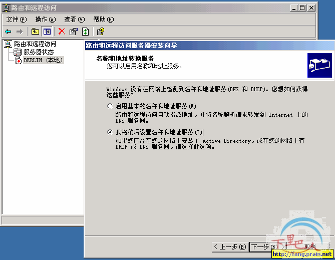 2、在控制台中,右键单击BERLIN(本地),在弹出的对话框中,选择“配置并启用路由与远程访问”,出现如下几图界面,这里以图说明,不多说,上面的提示应当是够详细的了: