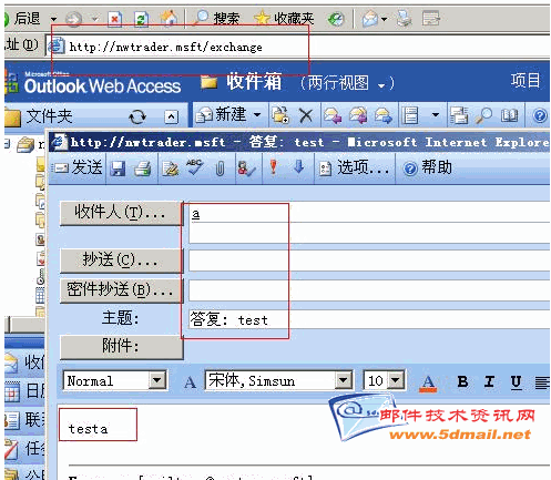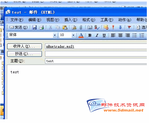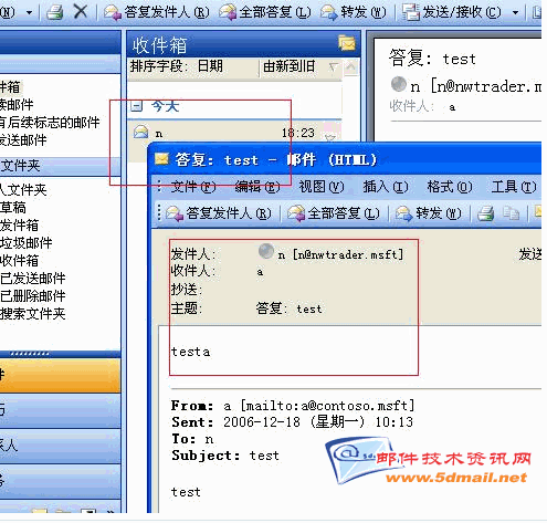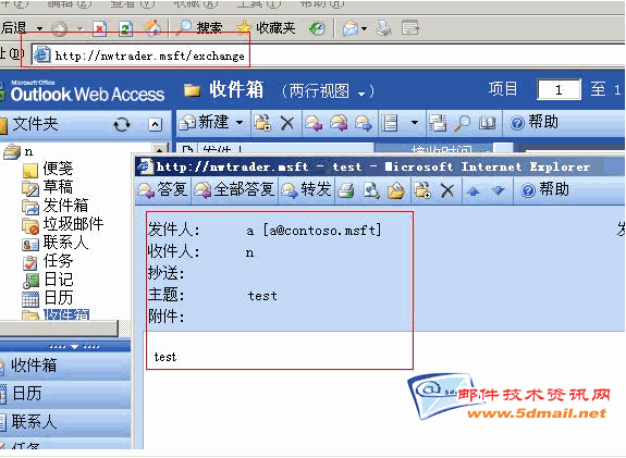 给nwtrader.msft的用户n发一封test邮件.以及nwtrader.msft上用户n的收信结果.