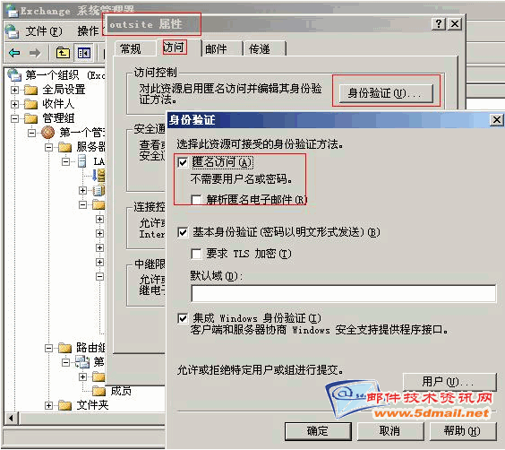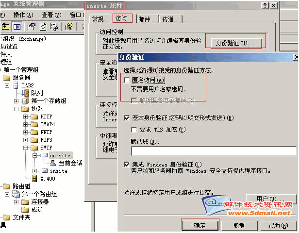 身份验证保持默认的,因这个SMTP虚拟服务器专用来接收外来邮件.所以要启用匿名.