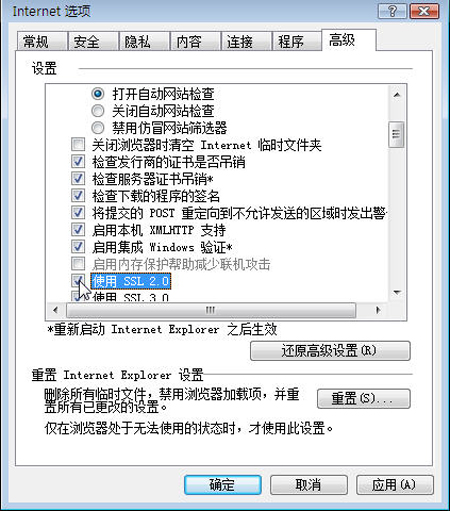 小提示:如果修改设置后问题依然没有解决,那么我们还应该在IE浏览器的internet选项中高级标签下的“使用SSL 2.0”勾选,因为默认情况下IE7把SSL 2.0协议过滤掉了,如果https网站恰巧只能使用SSL 2.0协议访问就会出现错误提示。(如图7)