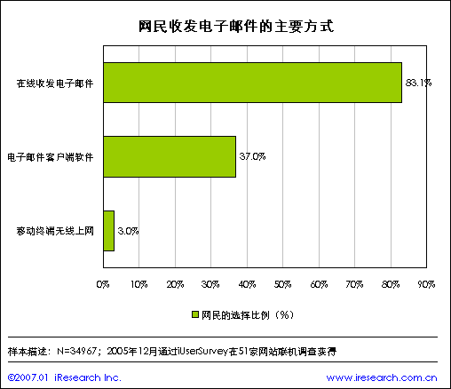 iResearch艾瑞市场咨询根据2006年艾瑞第五届互联网大调研数据显示,在线收发电子邮件依然是网民处理邮件的主要方式,这一比例达到83.1%;其次是通过邮件客户端软件,如foxmail、outlook,占到37%;使用移动终端接受电子邮件的用户只占到3%.