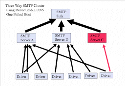图 2 说明了使用循环 DNS 的问题。由于 DNS 的工作方式和高速缓存 DNS 记录的可能性,如果某台主机发生故障,邮件代理也许仍会尝试联系它。至少,邮件会被延迟,一直等待连接超时,然后被排入队列,并在补偿时间之后重新发送。