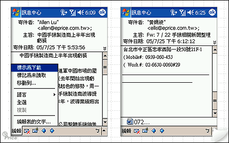 透过GPRS下载下来的邮件,服务器端仍会保持备份,所以使用者不用担心会有信件下载后,在服务器端信件却消失的情形发生。而信件内容的显示,会以分段的方式呈现,待使用者阅读完第一段的主旨和内容后,再决定是否要继续阅读下去,避免因信件容量太大而增加使用者传输费用的困扰。当然,附件的档案也采用同样的方式下载,如果是手机本身支持的档案格式,也可以直接进行点选查阅的动作!