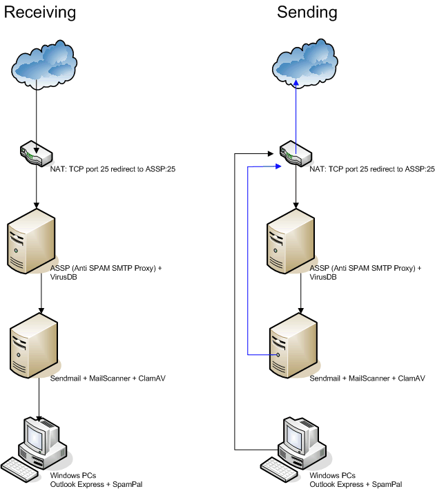 Outlook Express (with SpamPal + AntiVirus Software)ASSP 與 Sendmail 安裝在同一部電腦上的使用範例: