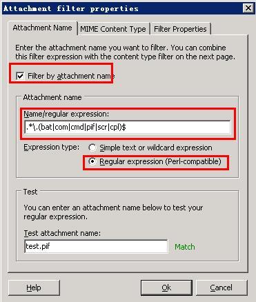 (3)在附件过滤属性里, 启用"Filter by attachement name", 可根据实际需要选用相应的表达式, 假如你不想接收以.bat .com .cmd .pif .scr .cpl为后缀的附件, 则在Name/regular expression填入: .*\.(bat|com|cmd|pif|scr|cpl)$