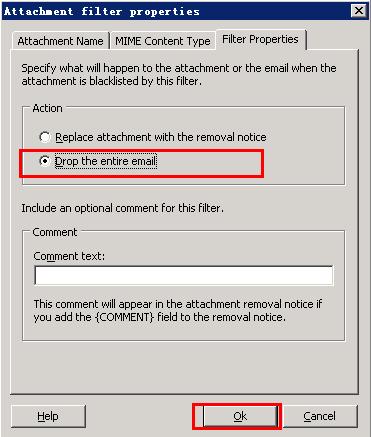 (5)如果附件符合你上面设置的条件,则把附件的内容替换掉或拒绝掉, 建议选用拒绝方式,即"Drop the entire email",这样收件人就不会收到这类邮件,且系统会发送拒绝信息给发件人。