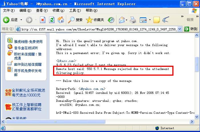 (7)从外网发送一个带附件的邮件给内部用户,如果附件符合过滤条件,发件人应该能收到类似如下的退信。