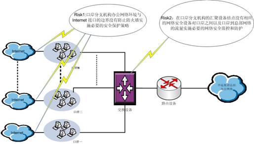 中远集运在全国各地,乃至世界各地分布着众多的分支机构多达几十个口岸,这就从客观上决定了在各个口岸分支机构存在网络边缘安全的问题。部分口岸在Internet 边界出口并没有合适的网络安全设备控制安全策略。这样很可能会造成,一个口岸的办公网络受到,病毒,蠕虫,恶意代码攻击,木马程序,流氓软件的置入,而迅速传播到其他口岸,并通过汇聚层网络设备传入中远集运总部的办公网络环境。