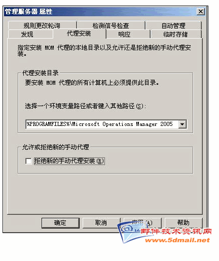 我们将使用手工安装MOM代理程序的方法。根据设计图纸,Exchange 边缘传输服务器安装在DMZ区域中,所以还需要制定相应策略来使MOM代理程序能够和内部网络中的MOM服务器相交互。