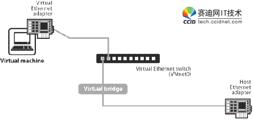 这种方式最简单,直接将虚拟网卡桥接到一个物理网卡上面,和linux 下一个网卡绑定两个不同地址类似,实际上是将网卡设置为混杂模式,从而达到侦听多个IP的能力。