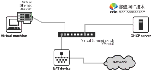 你会发现在这种方式下,vmware自带的dhcp会默认地加载到vmnet8界面上,这样虚拟机就可以使用dhcp服务。更为重要的是,vmware自带了nat 服务,提供了从vmnet8到外网的地址转换,所以这种情况是一个实实在在的nat 服务器在运行,只不过是供虚拟机用的。