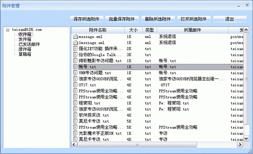 依次执行“高级/附件管理”操作进入管理界面(图2),此时你可在右侧管理列表中见到当前收件箱(或其他文件夹)内所有邮件附件,在这儿你可以快速完成对邮件附件的保存、删除、打开等操作。操作步骤:首选选择你想要进行操作的附件名称,随后再点击相关功能按钮即可,如保存所选附件、打开所选附件等。