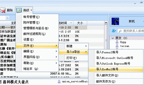 2、提高客户端转移效率:为了最大程度的方便其他客户端转移到酷邮4平台上来,酷邮的导入功能得到加强,用户只需执行指定的导入命令即可将OE、Outlook、Foxmil的账户信息、联系人、邮件等数据导入酷邮。导入操作可以是在第一次使用酷邮时,也可以在日后依次执行“高级/文件/导入&导出”操作,随后选择有关要导入的类型即可。(图3)此外,新版本的日程实现遵循标准的协议,可以与Outlook、Gmail进行互通。