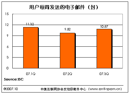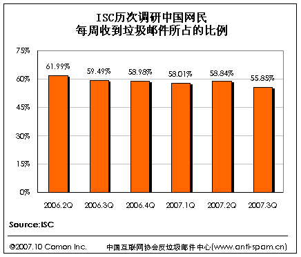 中国互联网协会反垃圾邮件中心公布了最新的中国反垃圾邮件状况调查报告。数据显示,2007年第三季度中国互联网电子邮件用户每周收到的垃圾邮件比例为55.85%,较上个季度的58.84%下降了2.99个百分点,并连续几个季度呈下降趋势。