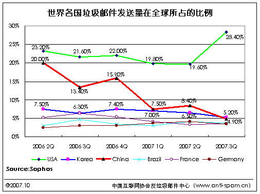 据Sophos最新调查报告显示,今年第三季度,从中国发出或转发的垃圾邮件占全球垃圾邮件发送总量的4.9%,与今年第二季度相比下降了3.5个百分点。垃圾邮件数量排名也由全球第二位降至第三。美国仍是网络垃圾邮件发送量最大的国家,有超过四分之一的垃圾邮件来自美国。而韩国上升成为全球第二大垃圾邮件国家,占所有垃圾邮件的5.2%。
