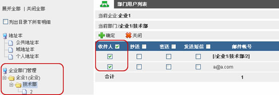 在弹出的窗口内,可以从左侧的树形菜单里面选择对某企业、某部门下的员工来发送邮件。