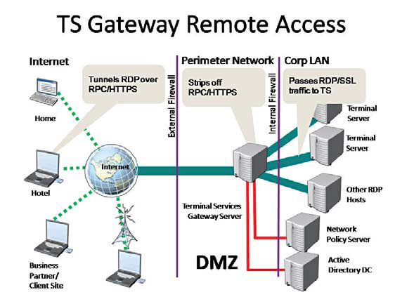 TS Gateway 是 WindowsServer 2008 的 Terminal Service 的新角色服務 (Role Service),也就是在新增終端機服務角色的時候會另外詢問是否安裝的一個服務。TS Gateway 利用 RDP overHTTP S的運作方式,讓任何 Internet 的連線使用者先連結到 TSGateway 伺服器,然後再重導向到更後端的終端機伺服器。(如圖 6)