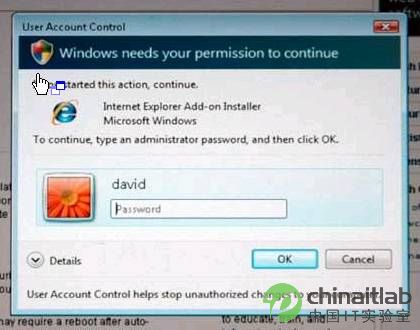 当用标准受限用户安装软件的时候,Vista会弹出输入管理员密码的提示