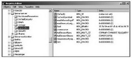 图19 NETCONFIG命令运行前LanmanServer注册表值 运行后的注册表见图20